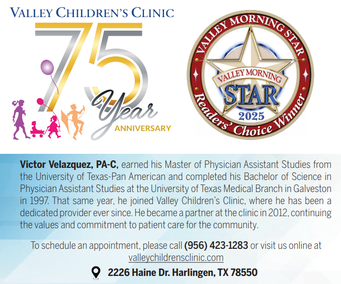 Victor Velazquez, PA-C: Graduated from the University of Texas-Pan American with a Master of Physician Assistant Studies, and graduated from University of Texas Medical Branch, Galveston, Texas with his Bachelor of Science in Physician Assistant Studies in 1997. Mr. Velazquez joined Valley Children’s Clinic in 1997 and became a partner in 2012.